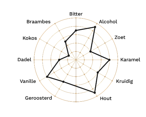 Smaak: het houterige omhult de aroma’s van broodkorst, de geroosterde accenten van de mout alsook de rum en rook toetsen.